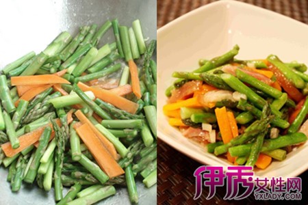 芦笋翻炒三五分钟再放入胡萝卜片一起翻炒,两分钟之后再加入辣椒丝快速翻炒,放入适量食盐、味精、食醋、料酒等入味,一分钟即可出锅。