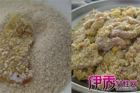 准备好已经打匀的蛋黄液和面包糠,将每个鸡肉条都均匀的蘸上蛋黄液再裹上面包糠。