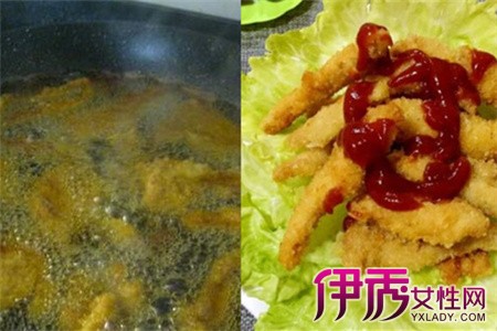 将鸡肉条放入油锅中进行煎炸,至鸡肉条变成金黄色就可以出锅了。如果嫌太油的话可以用厨房吸油纸除去多余的油。