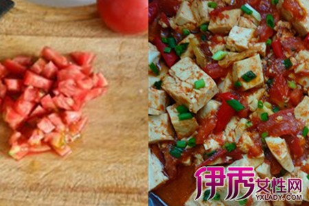3、西红柿烧豆腐准备好一块白豆腐,2个西红柿,一些香葱。将白豆腐切成块状,西红柿也同样需要切成块状。油锅烧热以后,将豆腐块放进锅里面煎,用中小火将它煎成双面变成金黄色把它捞出来放在一边备用。再倒入一些食用油放锅里,把切好的番茄倒进去翻炒一会,把它的汁水压出来。