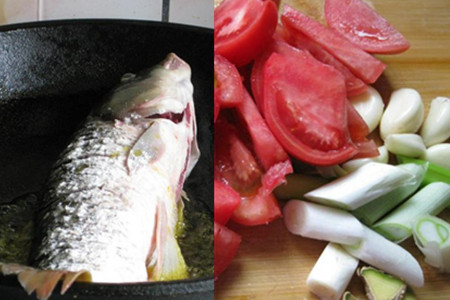 鲤鱼宰杀,去掉内脏和腥线,刮掉鱼鳞,冲洗干净,在鱼身表面扑上一些干面粉。在锅里倒适量食用油,烧至六成热,下鲤鱼煎制,一面煎金黄后用铲子轻轻给鱼翻面,两面都煎金黄后盛出锅。西红柿洗净切大块,大葱切段,生姜切片,大蒜切片。