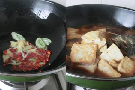 再往锅里加点油,烧热后,下葱、蒜、姜、干辣椒爆香,加适量白酒、生抽、少许白砂糖、小米椒煮开,再加小半锅清水,放入煎好的鲤鱼和豆腐块,加盖,转中火焖煮至汤汁收干,即可出锅。