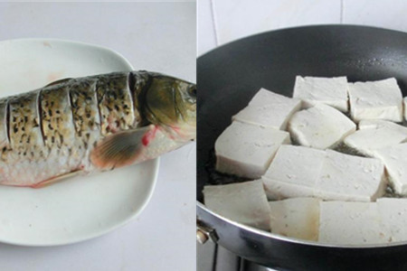 在锅里加适量食用油,烧热,下豆腐块煎制,豆腐两面都煎黄后盛出锅备用。再把鲤鱼也放入锅里,煎至两面焦黄后盛出锅待用。