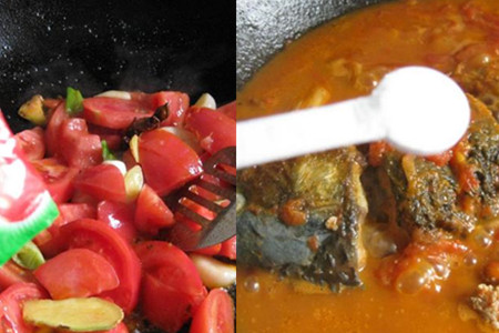 用锅里煎鱼的油将葱姜蒜爆香,加入两个大料炒香,下切好的西红柿翻炒,再加入适量的番茄酱、一勺白砂糖、适量生抽、一大碗清水,煮开,放入煎好的鲤鱼,加适量食盐,中火煮至汤汁收干,出锅前撒一些小葱末即可。