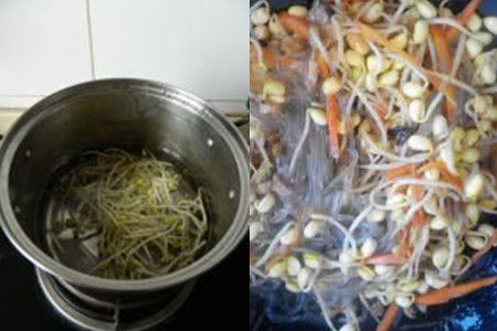 然后,在锅中加入适量的清水,大火烧开沸腾后,把黄豆芽放入焯一遍水后捞出。把粉条事先放入一个碗中,倒入些热水泡软,热水的量一定要没过粉丝。