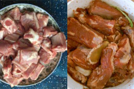 然后,就是腌制排骨段。在捞出沥干表面水分的排骨段中,逐一加入蒜泥、葱段、料酒、叉烧酱、蚝油,腌制四五个小时左右。一定要搅拌均匀,让每块排骨上都裹上一层酱汁。