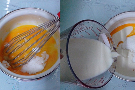 第二步,将淀粉与白开水搅拌均匀,缓缓倒入牛奶中,顺时针不断搅拌、煮沸,然后再晾凉。