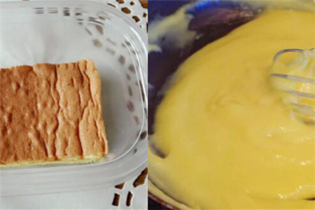 然后就是将蛋糕胚体和卡丝达酱进行组合了。先在模具(可以使用小方盒)中加入一片蛋糕胚体挤上适量的淡奶油。再覆盖上一片蛋糕胚体,挤上卡丝达酱然后再撒上一层黄豆粉即可。这样一款美味的日式豆乳蛋糕就完成啦。【女物原创未经允许,谢绝转载!】
