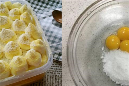首先将3个鸡蛋黄和50g白糖用打蛋器搅拌均匀,然后将过了筛子的低筋面粉和玉米淀粉加入蛋黄液中,再次用打蛋器搅拌均匀。
