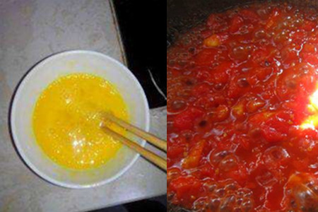 2.小葱切成小段,生姜、蒜瓣切碎成末,装到碗里备用。番茄去皮(可以先整个蒸一下然后就很方便的去掉皮了)切成小块。鸡蛋打碎放到碗里,加适量的盐,然后打散备用。