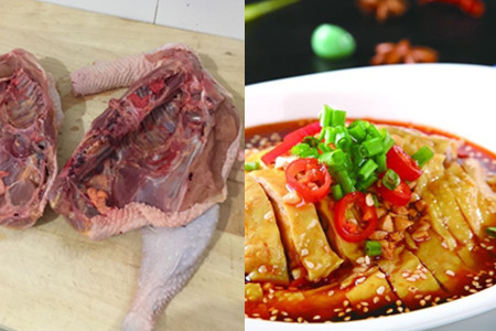 第四,冰透的鸡肉切成大小适宜的的块状码入盘中,浇上以上的酱汁儿即可食用。
