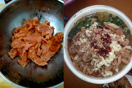 第五,将腌好的肉片划散到锅中,待到肉片变色即可捞起放入容器中。将剁碎的花椒、辣椒、蒜末均匀地撒在肉上。烧热新油浇在肉上即可享用。