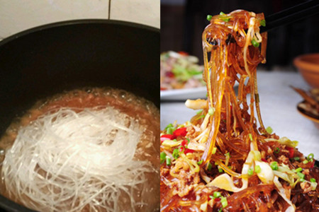 第四,锅内炒匀后倒入小碗清水,调入糖、盐、酱油,待到水烧开后入粉丝煮软,撒入蒜苗即可起锅享用。