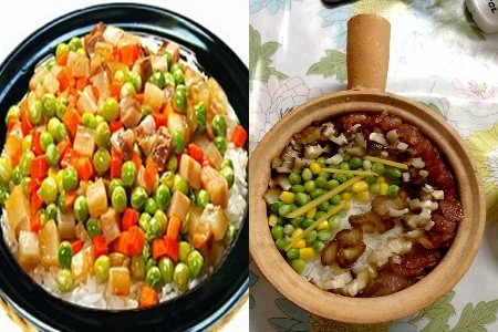 腊肉煲仔饭在广东真的是颇为常见的一道菜,差不多每家餐厅都会有。把白米洗干净后放到小煲仔里面。腊肉也是洗干净后切成片放进煲仔里。青豆少许也是放在一起。所有原材料准备好后加入适量的清水在煲仔里,盖上盖。大火煮开后转小火慢慢的焖煮,不要太大火,因为水容易干,米容易煮糊而不熟。待确定米变成饭后撒上生抽调味即可。