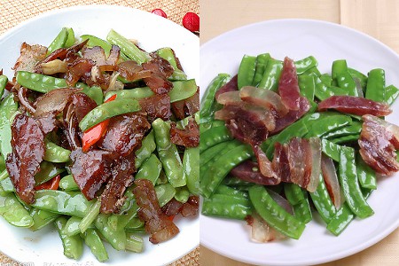 腊肉炒荷兰豆简单容易,是很多人的最爱。腊肉洗干净后切片。荷兰豆洗净并晾干水份。蒜苗切得段。锅热油开后先把腊肉放下去中小火炒。待腊肉炒至稍为出油后把荷兰豆也放下去爆炒。来回翻炒2分钟后加少许的水,然后把蒜苗也放下去,盖上盖子,大约5分钟后,撒上少许盐巴,蚝油调味。味道调好后就可以上桌了。