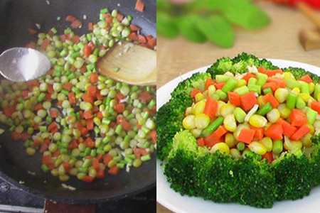 西兰花切成小块,蒜台切小段,胡萝卜洗净切丁。在锅里加入适量清水,撒入少许食盐,烧开,倒入西兰花烫熟,捞出锅,控干水分,摆在盘上。用烫西兰花的开水把玉米丁和胡萝卜丁烫熟,捞出沥干水分。
