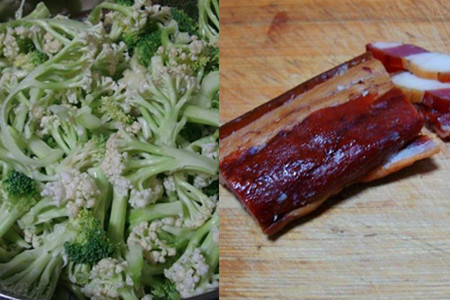 西兰花和菜花撕成小朵,放入淡盐水中泡十五分钟,捞出滤干水分。腊肉挑选肥一点的,洗净切成薄片。