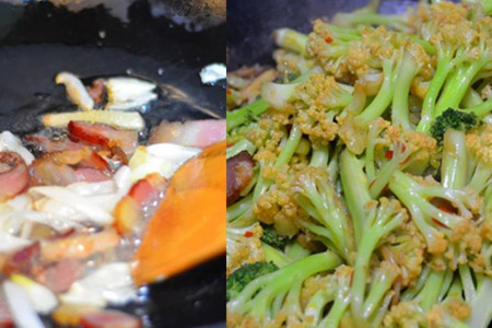 食材:西兰花1棵、菜花1棵、腊肉50克、剁椒、豆瓣酱、葱、姜、生抽、蚝油、花雕酒、白砂糖、植物油、食盐。