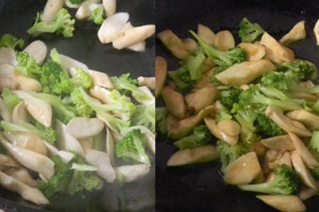 热锅凉油,下大蒜片爆香,加入烫过的杏鲍菇翻炒一会儿,接着加入烫过的西兰花,加入适量生蚝汁、食盐、白砂糖,大火快炒,再淋点香油炒匀即可出锅。