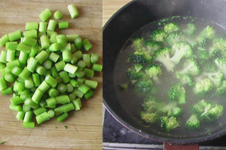 在锅里加入适量清水,烧开,下杏鲍菇片,稍微烫片刻,捞出滤干水分待用。西兰花也放入烫过杏鲍菇的开水中,加点盐和食用油,烫一分钟后盛出锅备用。