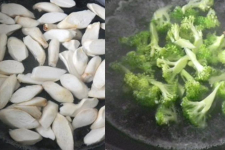 食材:杏鲍菇150克、西兰花、生蚝汁、大蒜。杏鲍菇洗净切片,西兰花揪成小朵洗净,大蒜拍碎。