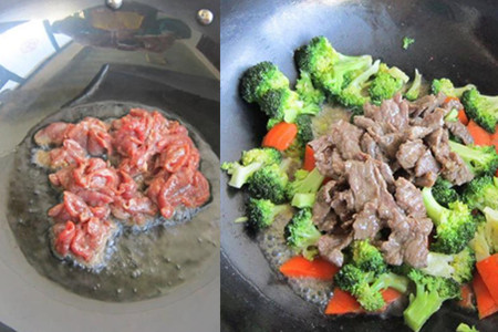 热锅凉油,油烧热至七成,下牛肉片煸炒,炒至没有血色后盛出备用。再往锅里加适量植物油,烧热至八成,下姜片和胡萝卜片炒香,下烫过的西兰花,翻炒片刻,加适量食盐和味极鲜,翻炒两分钟后倒入炒过的牛肉片,最后加适量鸡精炒匀即可出锅。
