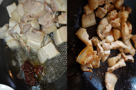 6.炒锅开火放油,热油锅下肉片煎炒,至肉片表面微卷,然后转小火。放大半勺郫县豆瓣酱和蒜末爆香,炒出红油。然后加一勺甜面酱、一勺料酒、一勺炖肉的汤汁。