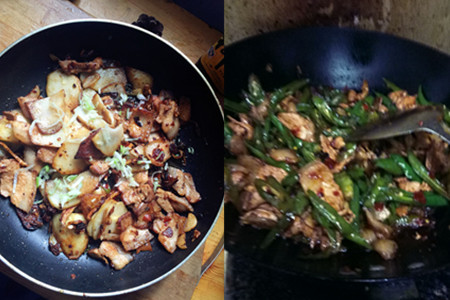 7.慢慢炖出肉香后,放入小青椒丝和小葱丝煸炒熟,然后中火慢慢收汁。最后加适量的食盐和鸡精调味,就可以关火出锅了。【女物原创未经允许,谢绝转载!】