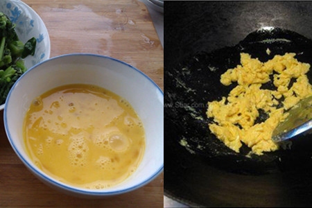 3.炒锅烧热,然后放油,用生姜末和蒜末炝锅,出香味后倒进事先打散备用的鸡蛋。炒锅转至小火慢慢把鸡蛋摊熟,然后用铲子切成小块从锅里盛出来到碟子里备用。