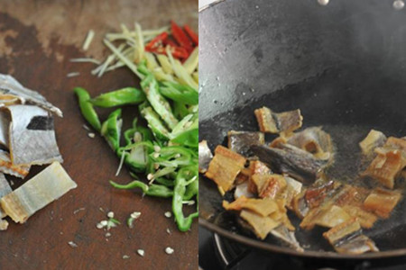 在锅里加少许食用油,烧热,下鳗鱼干煸炒,加入姜丝炒香,下青椒丝与红椒丝,加适量食盐,大火快炒,最后沿着锅边淋入一些清水,加盖,焖煮至汤汁收干即可。鳗鱼干提前用水浸泡,可以节省炒制时间。