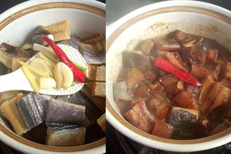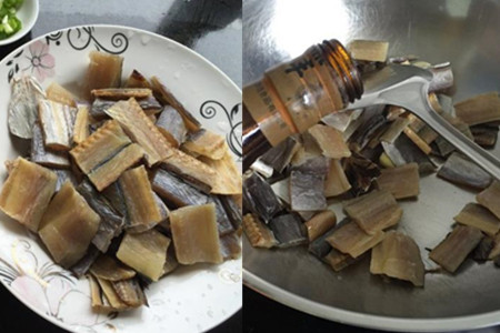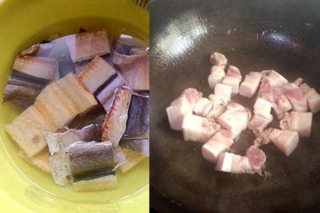 鳗鱼干切小块,放入清水里泡上两个小时左右。五花肉洗干净,切成小方块。热锅凉油,下五花肉块煸炒,稍稍炒出肥油后,淋入一些老抽,翻炒上色均匀。