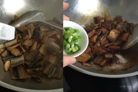 再加入适量食盐、老抽,翻炒上色入味,煮熟后,撒上切好的葱花就可以出锅了。