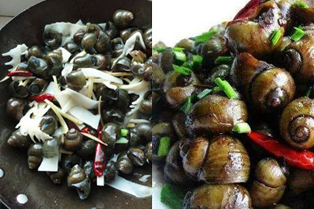 第三,起热锅入油,下辣椒、蒜末爆香后,迅速下田螺爆炒,期间下适量料酒焖一会儿。开盖后下清水,待到水煮沸后,下盐、酱油调味翻炒,待到汁水收干即可起锅。