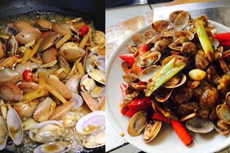 第二,起热锅入油,加入蒜末、辣椒酱、豆豉酱炒香后,迅速放入清理干净的花甲进行翻炒,翻炒片刻后加入适当的水和盐,盖上锅盖焖煮8min左右。