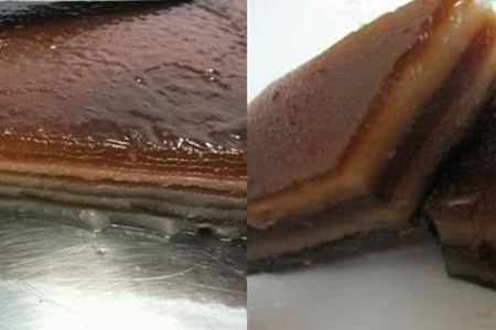 然后再打开锅盖,倒入一层椰浆粉浆,注意要倒均匀,不要太厚也不要太薄,厚度要与黄糖层稍微厚一些,做出来的马蹄糕才漂亮。倒好后再蒸上5分钟,再倒入一层黄糖粉浆,蒸上同样的时间。这样反复进行,直到最后一层为黄糖层就可以了。