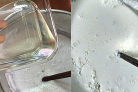 第一步就是把马蹄粉和椰浆分别倒入两个玻璃容器中。这时候也能分辨出马蹄粉的优劣和椰浆的新鲜与否。马蹄粉没有衣物和异味,椰浆没有沉淀物,颜色纯白,才能用。