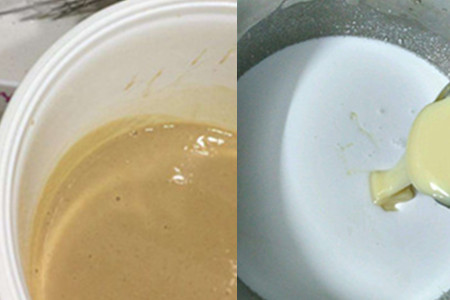 第五步就是把冷却好的糖水倒入其中一份粉浆中,轻轻搅拌均匀。然后在往另一半的粉浆中倒入椰浆和炼乳,分量要酌情处理,尤其是炼乳不要放太多,150克左右即可。放入这些后,也要搅拌均匀,不要用力过度造成水乳分离。