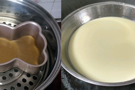 第六步就是蒸糕了。选择可以放模具在上面的深口锅,加水烧开。在等待的过程中,把要用的模具刷干净,抹上一层薄薄的食用油,防止粘锅。然后等水沸腾就可以放一层模具上去。先把搅匀的黄糖水轻轻倒入模具当中,薄薄的一层就可以,然后盖上锅盖,蒸上5分钟。