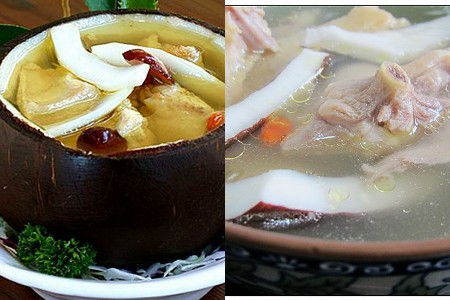 还有一道讲出来相信大家都超级喜欢喝的,那就是鸡炖椰子汤了。买椰子的时候把里面的水装好,肉叫老板取出并带回家。处理鸡是一样的,市场买活鸡的时候宰杀并去掉内脏,回来后洗干净并斩成一大块的。把汤锅注入清水,并大火煮开。把鸡肉和椰子肉同时放下去中小火炖2小时。时间一到就把椰子水也加进去。
