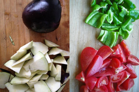 2.把准备好的茄子(圆茄子、长茄子都可以)用菜刀滚刀切成块,青椒切成小片,西红柿去皮切成小块(西红柿蒸一下可以去皮)。小葱切成非常小的段,生姜切末,蒜瓣拍碎也要切成末。