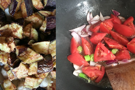 6.下冰糖两三分钟后倒进刚刚切好的西红柿块,翻炒一会出汁以后把刚刚炸好备用的茄子倒入,然后倒适量的老抽调色,滴少许香醋提味,再混合翻炒均匀。