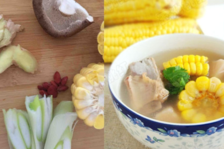 准备好一锅清水,将排骨和姜片先放进去炖煮,水煮沸了以后,将上面的泡沫捞干净,把玉米加进去用中小火炖大约1小时就好了。