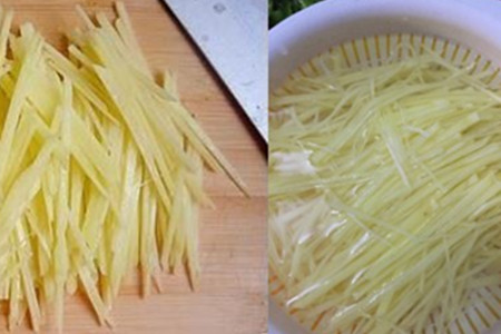土豆也不能切的很细,稍微的粗点也是没有关系的,切土豆丝最重要的是要切的均匀,不要一根非常粗,一根特别细。切完的土豆丝放水里浸泡,不要在空气里暴露的时间过长就会变色。炒的时候直接捞出来沥干水分就可以炒。【女物原创未经允许,谢绝转载!】