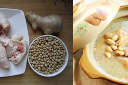 在砂锅中放入黄豆和猪脚,以及适量的水和姜片。用中小火大约熬制2到3小时左右,放一些食用盐就可以吃了。