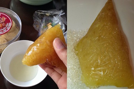 包碱水粽要比包咸粽(里面带馅料)的方便简单些。广东客家人一般都是包三角形的粽子。隔天就准备浸泡糯米了,洗好粽叶,一切准备就绪后,就开始包。一个个粽子包好后用绳子邦好再放到高压锅里面去煮,大概压2小时这样就差不多可以捞出了。等到放凉之后就可以把粽叶去掉并试吃,碱水粽是没有什么味道的,要加上蜜糖才好吃,糯滑可口。