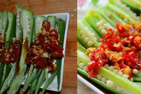 把蒜切碎切成蒜蓉,辣椒切成辣椒碎,在锅中倒入油,烧热后将准备好的蒜蓉和辣椒碎放入锅中翻炒,炒好后装入碟子中备用。然后将准备好的秋葵一分为二或者一分为四。一一摆放在碟子中,将之前做好的蒜蓉辣椒油淋在上面,这样一道爽口又好吃的凉拌秋葵就做成了。当然,如果你喜欢味道更香一点,可以适当滴入一点香油。