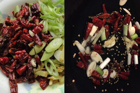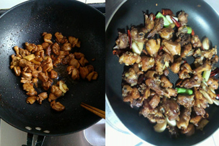 5.炒锅放适量的油(刚刚炸鸡块的油就好,避免浪费),蒜末和姜末倒入锅里爆香,然后把花椒麻椒末倒入,再把鸡块和朝天椒段一起倒进锅里翻炒,炒出辣味把青辣椒块倒进锅里翻炒,三至四分钟后加入适量的料酒、香醋、食盐后搅拌均匀熄火,再撒少量鸡精调味出锅。