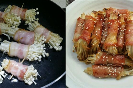 如果是做给小朋友吃的话,可以将金针菇和培根切成两段再卷起来。制作方法和上面介绍的一样。