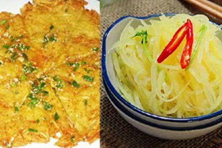 接下来再给大家介绍一款土豆饼的做法。首先,我们要将土豆切成丝,然后在沸水里面焯一下。