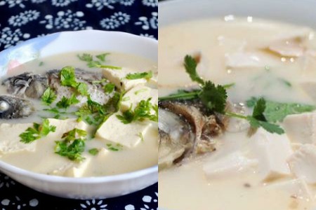 豆腐跟鲫鱼搭配成汤也是很鲜美的。豆腐买回来后切小块。鲫鱼宰杀后去内脏并洗干净。葱切粒。姜切片。锅烧热后先把鲫鱼放下去煎至两边成金黄色。然后倒入适量的清水煮15分钟。接着再把豆腐和姜片也放下去再煮10分钟,此时汤已经变成奶白色了。撒少许盐巴,料酒,胡椒粉。试过味后觉得可以就把葱花也撒下去就完成了。